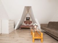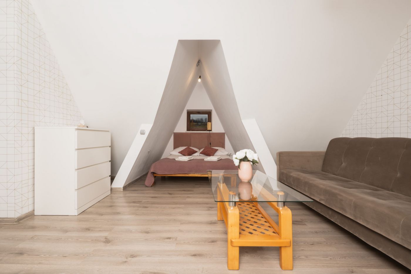 - w apartamencie dwupoziomowym składającym się z części sypialnianej, łazienki z prysznicem, balkonu oraz salonu połączonego z aneksem kuchennym.