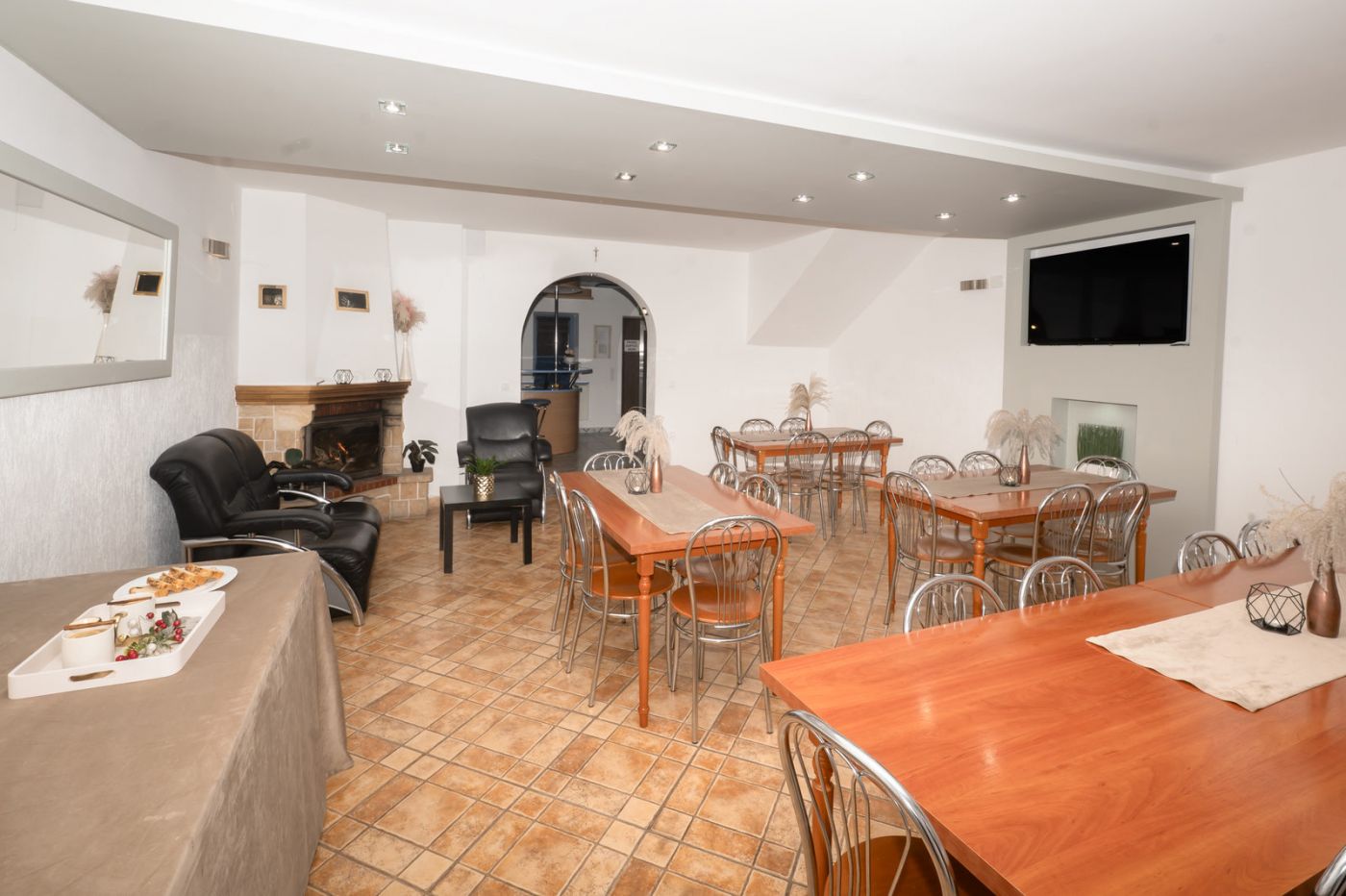 - salon kominkowy z częścią jadalną, TV, piłkarzykami